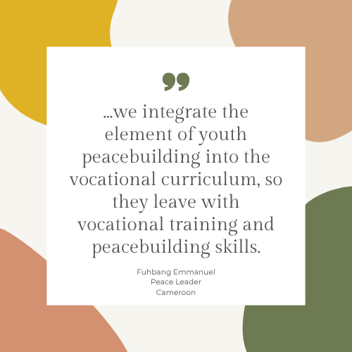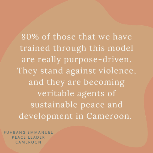 Before the integration of the economic aspect, what really was very striking to us was that we were training youth, yet there were some that went back after our training and were still entangled in violence. But with the integration of this economic component, almost 80% of those that we have trained through this model are really purpose-driven. They stand against violence, and they are becoming veritable agents of sustainable peace and development in Cameroon. That is a very huge success, because when these people are self-reliant, they don't give in to those societal ills, like violence, crimes, and the rest.
