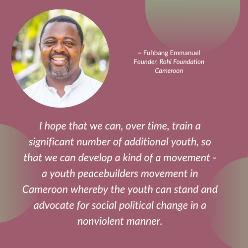 I have come to understand that peacebuilding is really fundamental in having a sustainable peace in the society. And peacebuilding is not only necessary during times of violence, it is needed before. I really regret and wish that if we had started this work before the advent of this violence in Cameroon, perhaps this violence wouldn't have ever occurred. It is also needed during and even after violence as well. There is still a high need for it here. We've had so many challenges.
